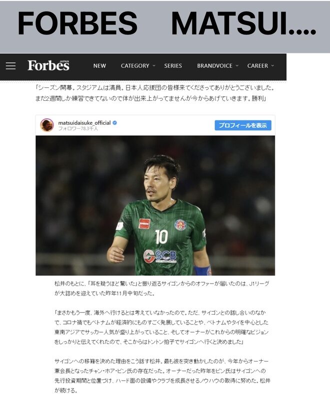 Vào tháng 12 năm 2020, nhiều fan hâm mộ bóng đá đã vô cùng bất ngờ khi nghe thông báo chuyển nhượng cầu thủ Matsui từ Yokohama FC ( đang thi đấu tại giải J1 ) sang Sài Gòn FC ( hiện đang thi đấu tại giải V-League Việt Nam ). Chuyển nhượng là điều không hiếm trong thế giới túc cầu, thế nhưng lý do gì mà vào mùa giải cầu thủ này bước sang tuổi 39, mà anh lại đưa ra quyết định tìm kiếm thử thách ở một thế giới mới. Nên nhớ đây là câu lạc bộ thứ 13, quốc gia thứ 6 (bao gồm cả Nhật Bản) mà anh dừng chân. Sau Pháp, Nga và các nước Đông Âu, và bây giờ là một quốc gia ở Đông Nam Á, nơi mà văn hóa tập quán và ngôn ngữ có nhiều sự khác biệt điều gì đã giúp Matsui chọn Việt Nam làm bến đỗ và giúp anh vẫn duy trì tinh thần lạc quan cũng như phong thái đỉnh đạc của một cầu thủ từng trãi trên sân cỏ.